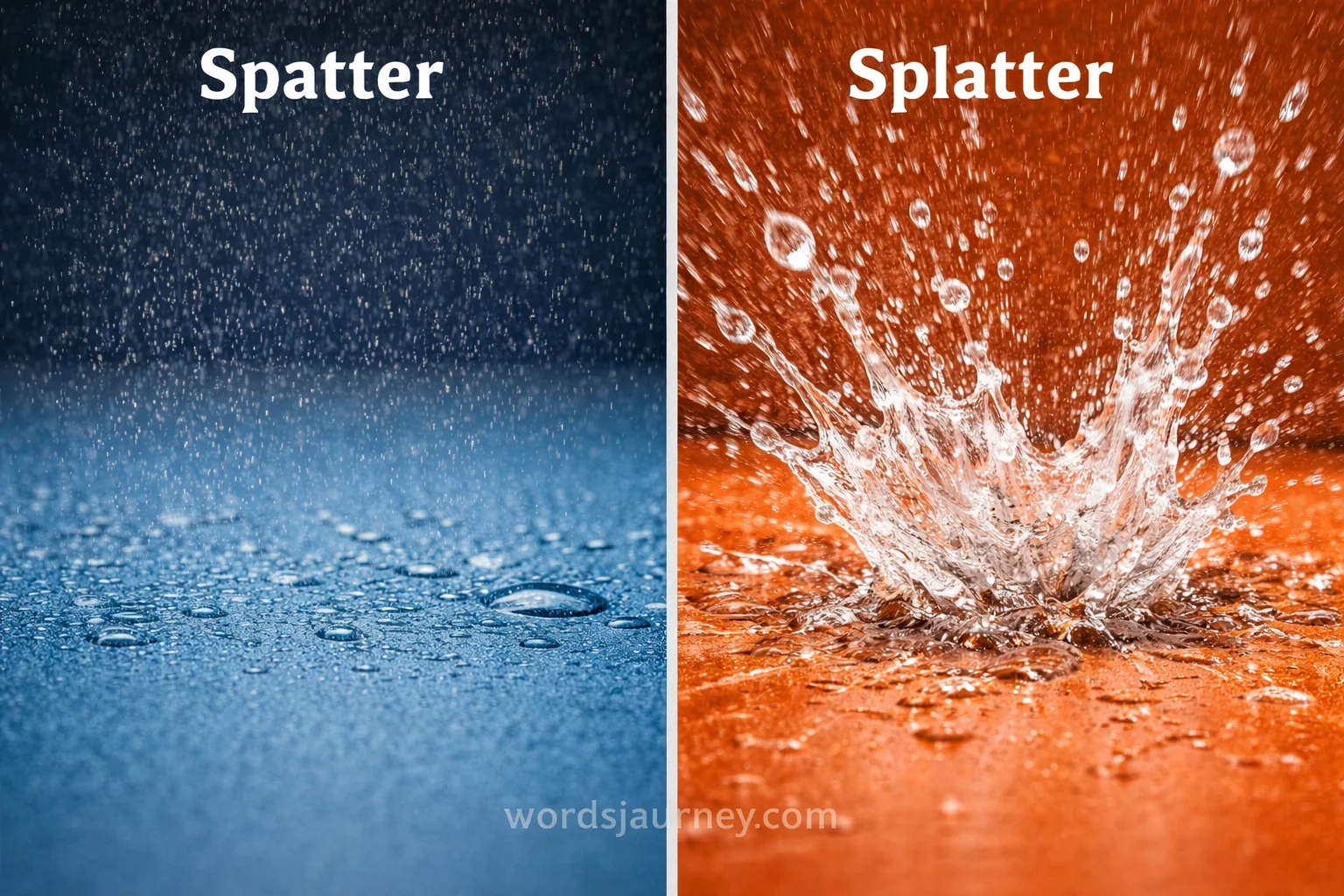 Splatter describes larger drops hitting a surface with force, spreading messily. It feels louder, more chaotic, and more visual.